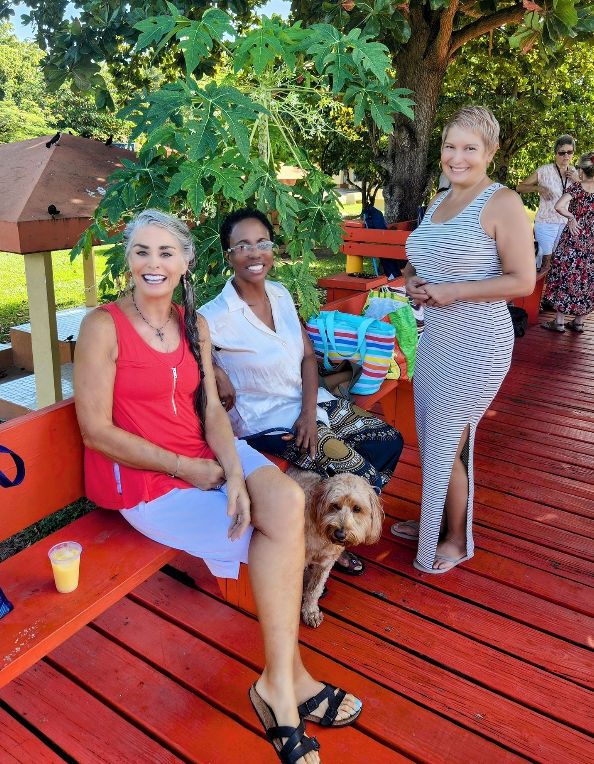 We meet at 9:30 am every Sunday morning on the wooden deck, under the canopy of the big almond tree at the public Baleneario of Rincon.